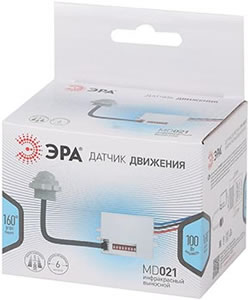 Датчик движения выносной MD 021 "Эра" позволяет производить включение осветительных приборов, питающихся от сети 220 В переменного тока, при появлении движущегося объекта в зоне обнаружения датчика.