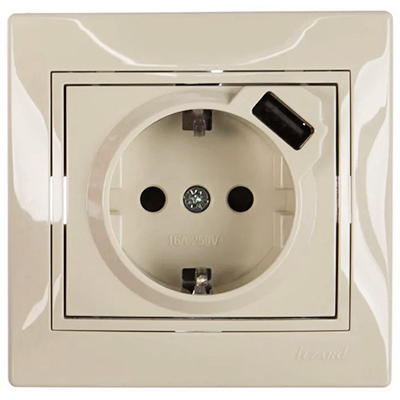 Розетка одноместная Lezard 701-0303-181 Mira (16 А, IP20) скрытой установки, с заземлением, c USB разъемом, кремовый