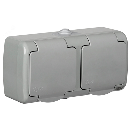 Розетка двухместная IEK РСш22-2-А Aquatic (16 А, IP54) открытой установки, с заземлением и шторками, с защитными крышками, серый