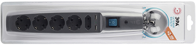 Сетевой фильтр пятиместный 2 м SFU-5es-2m-B "Эра" (10 А, надежный уровень защиты, 2 USB) с заземлением и защитными шторками, с выключателем, черный