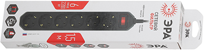 Сетевой фильтр шестиместный 1,5 м USF-6es-1,5m-B-BOX "Эра" (ПВС, 10 А, базовый уровень защиты), с заземлением, с выключателем, черный