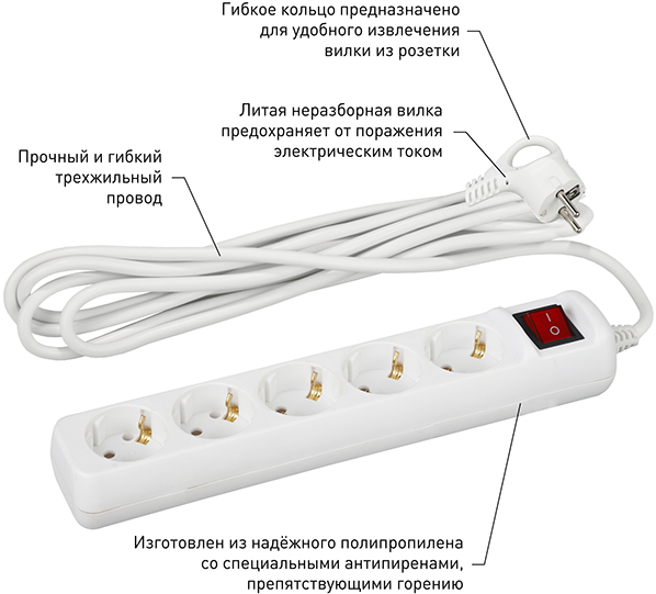 Удлинитель бытовой с заземлением предназначен для подключения электроприборов и электроинструментов мощностью до 3,5 кВт.