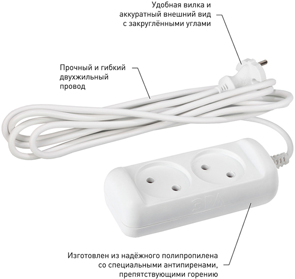 Удлинитель двухместный 3 м "Эра" UХ(6)-2-3m (6 А, 250 В, ПВС 2 х 0,75 кв.мм), белый
