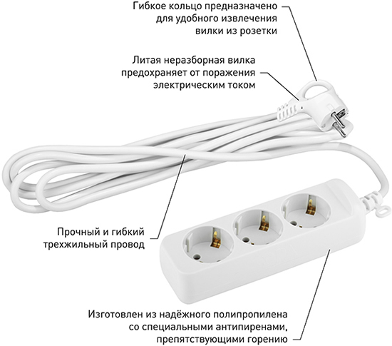 Удлинитель бытовой с заземлением предназначен для подключения электроприборов и электроинструментов мощностью до 3,5 кВт.