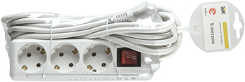 Удлинитель трехместный У03К IEK WYP10-16-03-05-ZK-N (ПВС 3 х 1,0 кв.мм, выключатель со световой индикацией), белый, 5 м