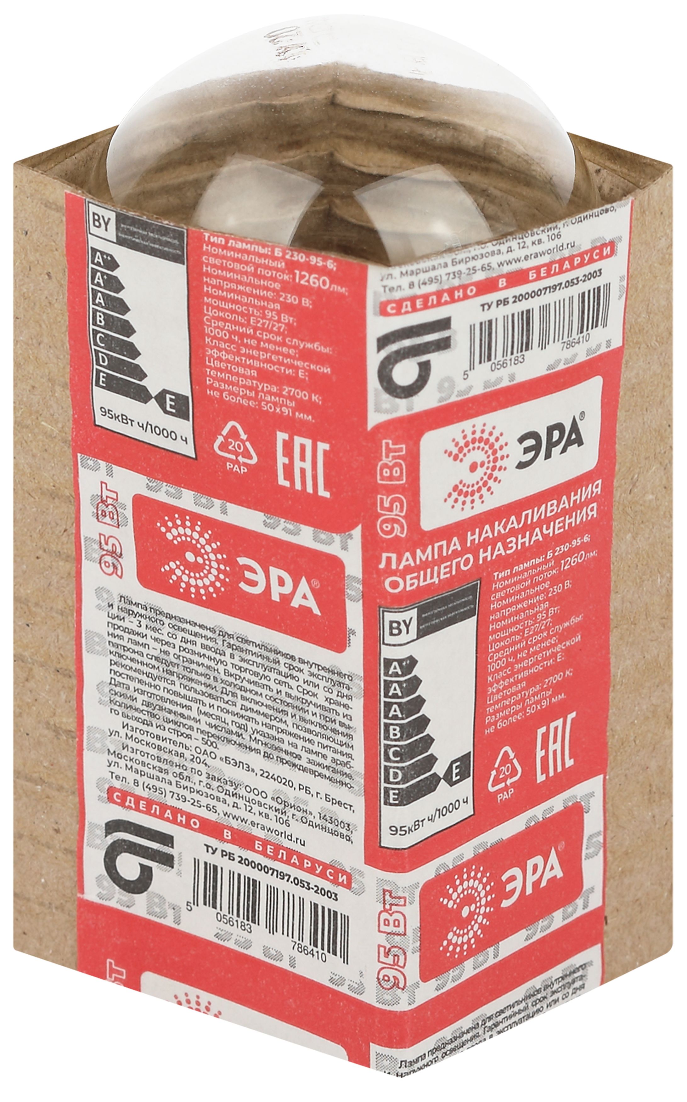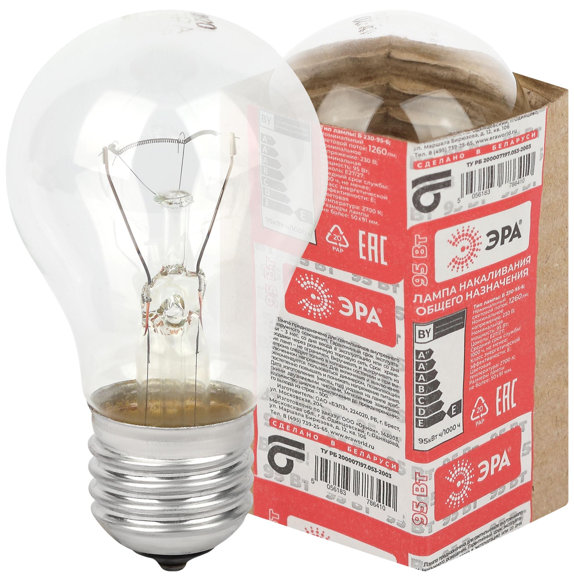 Лампа накаливания А50 230-75 Е27 "Эра" (стандарт, 75 Вт, 935 лм, колба прозрачная)
