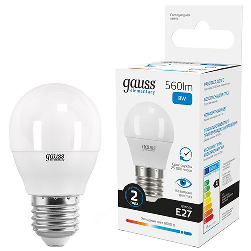 Лампа светодиодная Gauss 53238 Elementary (G45 шар, E27, 8 Вт, 560 лм, 6500 К)