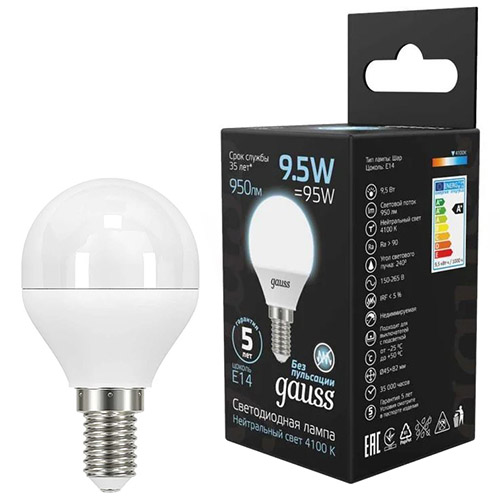 Лампа светодиодная Gauss 105101210 (G45 шар, Е14, 9,5 Вт, 950 лм, 4100 К)