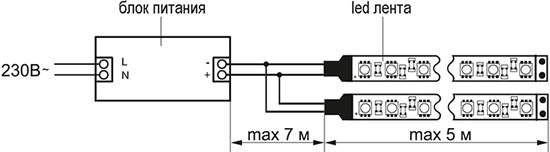 - Максимальное удаление светодиодной ленты от блока питания без потери освещенности не более 7 метров.