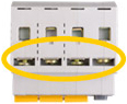 Возможность одновременного присоединения шиной fork и гибким проводником для распределения питания цепи через верхние зажимы, а также возможность соединения шиной PIN. |