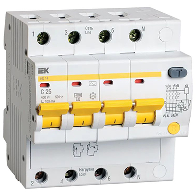 Выключатель автоматический дифференциального тока АД14 4Р 25А 100мА IEK (характеристика срабатывания C, тип АС, 4,5 кА)