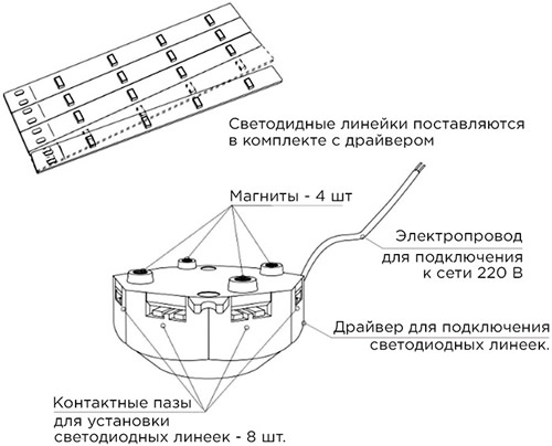 - Светодиодный модуль устанавливается на металлическую основу при помощи магнитов на корпусе драйвера.