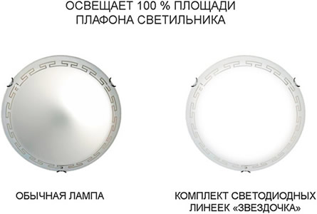 Комплект светодиодных линеек "Звездочка" предназначен для замены стандартных ламп, а также современных светодиодных источников света в настенно-потолочных светильниках.