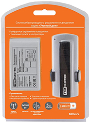 Комплект для беспроводного управления освещением ПУ1-МK-3 серии "Уютный дом" TDM включает пульт дистанционного управления и контроллер.