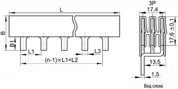 Шина соединительная типа PIN с шагом 27 мм предназначена для коммутации аппаратуры шириной, кратной полутора модулям.