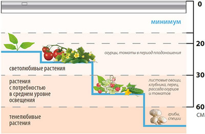 | Зависимость площади освещения от высоты подвеса: | Расстояние от светильника до листьев: |